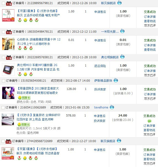 以上是本人設計的秒殺程式搶購淘寶網的商品。 從圖片成交可以看到,1分錢搶得價值200元大衣,1元搶得價值200元床單四件套,1元搶得價值600元電動吸奶器,以上是其中一些案例。